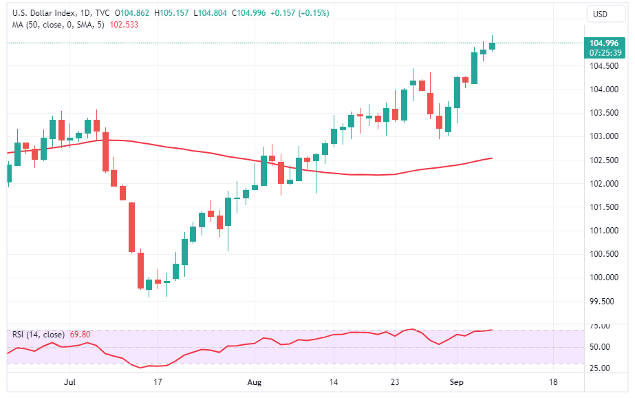Hingga pukul 22:39 WIB, Indeks Dolar AS yang mengukur kinerja USD terhadap sejumlah mata uang utama lainnya terpantau naik 0.11% di kisaran level 104.95.